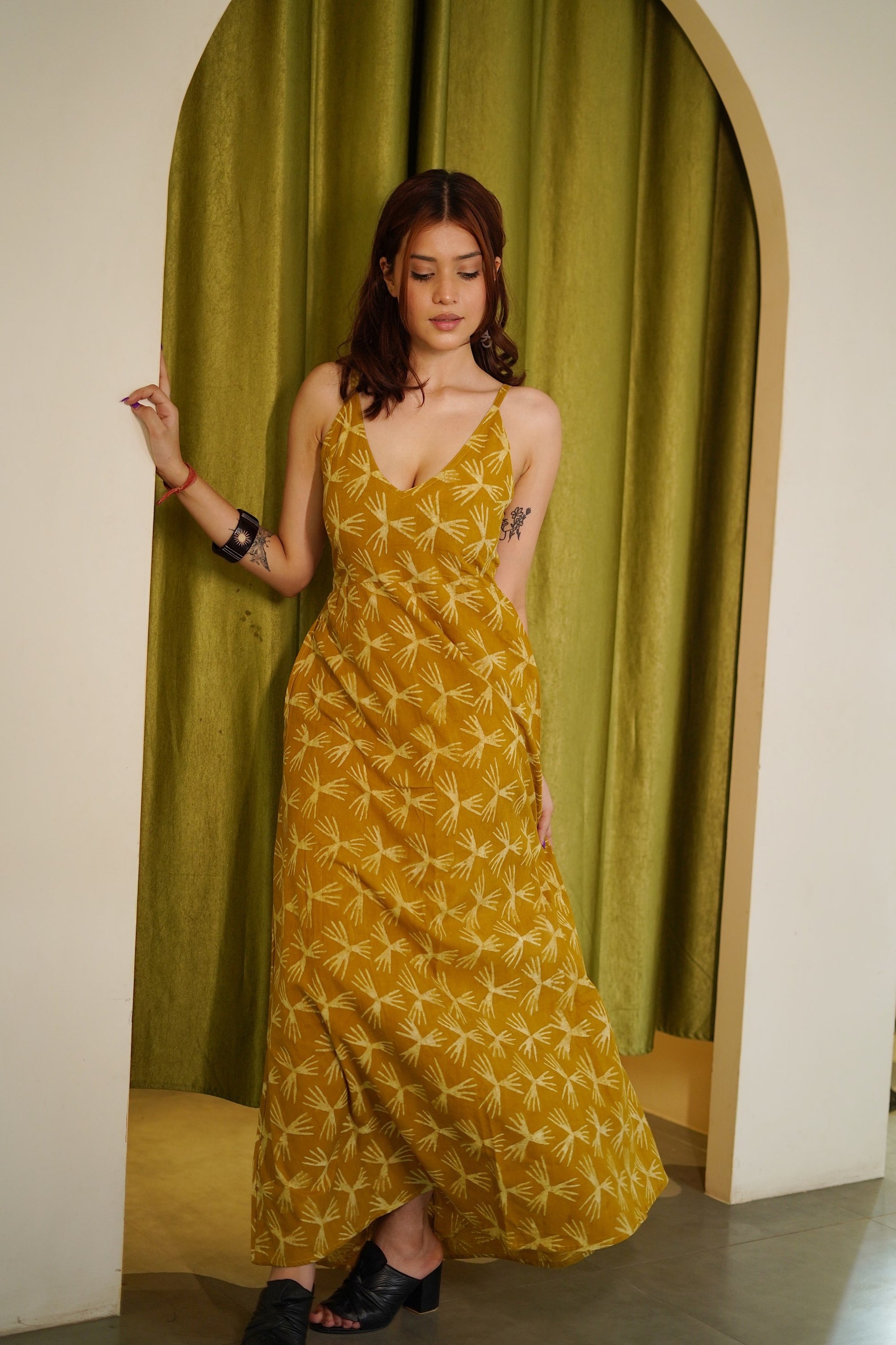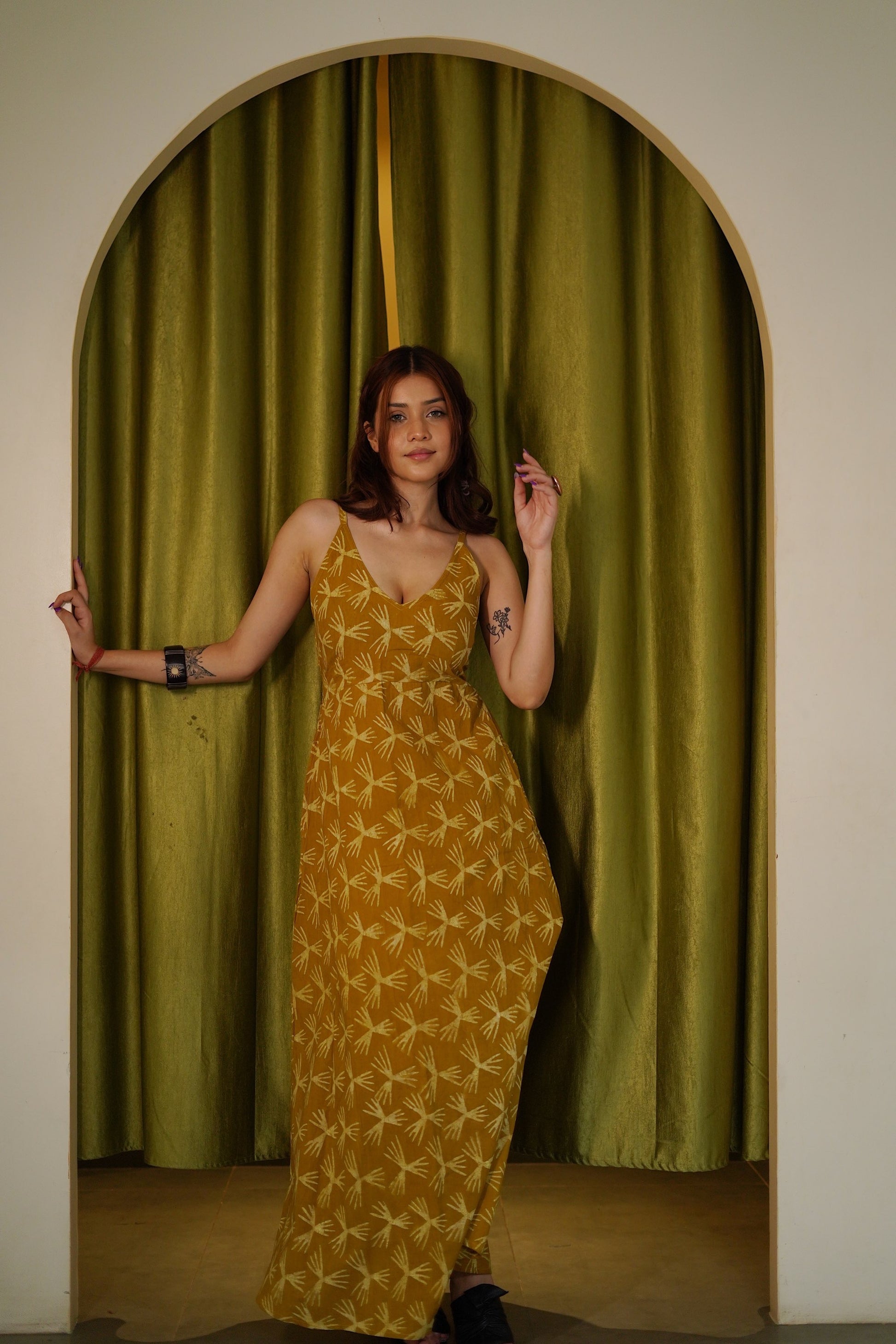 V-Neck Long Camisole dress with adjustable straps and smocked elastic at the back to fit like a glove. Modest with a feminine touch, our cami dresses are a perfect go-to and most loved by our community. Stunning mustard. (It also has pockets!)